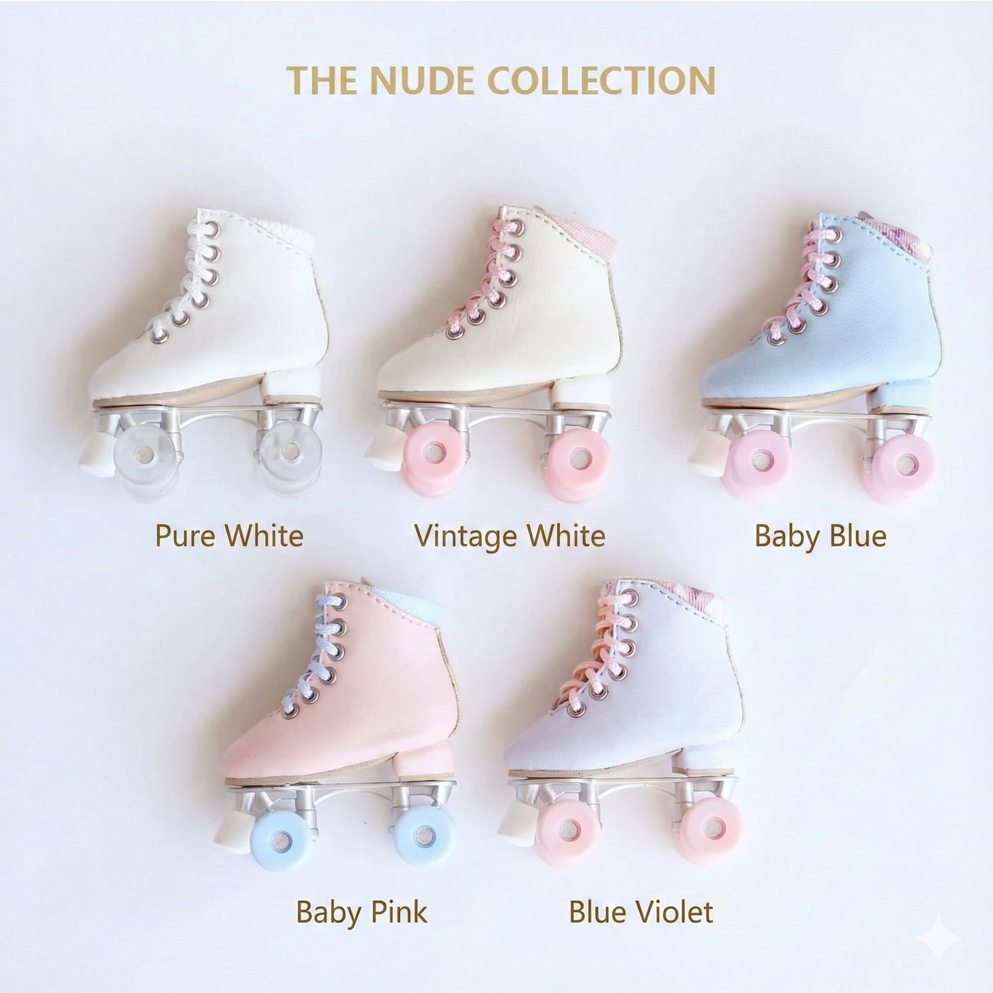 These adorable retro quad roller skates feature soft macaron-inspired pastel colors, bringing playful vintage charm to any doll outfit.